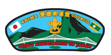 「愛媛スカウトの歌」の歌詞にある「石鎚のみね」「瀬戸の内海」「日の丸の旗」と愛媛県の象徴である「県旗」を取り入れました。