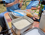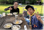 | 防災のための知識としてこの日は親子で防災クッキングにチャレンジしました。メニューは親子丼とポテトサラダです。まず、親子丼は①お米を洗って炊いていきます。今回はメスティンを使いました。②焼き鳥缶、豆腐、卵をポリ袋に入れて軽く揉みます。そこへだし醤油を垂らして湯せんにかけます。次に、ポテトスナック菓子注いでふやかしながらスプーンを使って潰していきます。スナックの形が無くなればあっという間に完成です。ビーバー隊も日ごろから学校などで、避難訓練や”ぼうさい”について考える機会があるため、「かんたんにできたね。」「じしんがきたら、こんなふうにごはんをたべたらいいね。」と感想が出ていました。『そなえよつねに』のきもちを、日頃の活動から学んでいるビーバー隊です! |