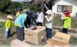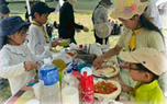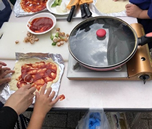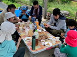 | 4 月に植えたミニトマト、ピーマン、とうもろこしがたくさん実をつけており、みんなで収穫しました。肥料を入れた土と入れなかった土で植えたピーマンの成長に違いがあることも発見できました。 ピザ窯はレンガを並べ、積み上げて作りました。1 人ひとり、自分の好きな野菜や具材を乗せてスペシャルピザです。採れたての野菜たっぷりのピザを、みんなで作ったピザ窯で焼いて、とてもおいしく出来上がりました。 |