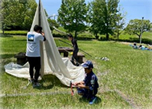 | 例年よりも梅雨が早く終わり、暑いながらも絶好のキャンプ日和となりました。ニモキャンプはカブ隊のくまスカウトのみで行うキャンプとなります。今年度はくまスカウトは1 名のみのため、少人数のキャンプとなりました。まず最初にフライテントを立てて日陰を確保しました。その後宿泊テントの設営をし、様々なカリキュラムに挑戦しました。夕食は、一人ということもあり、コンロ、かまど、メスティンという多用な調理器具を使って調理しました。夜はボーイ隊の指導者・スカウトが遊びに来てくれて一緒にキャンプファイヤーをして盛り上がりました。 翌朝は朝露で濡れたテントをさっと乾かして、解散しました。時間としては20 時間という短い時間でしたが、やはりキャンプは良いものです。 |