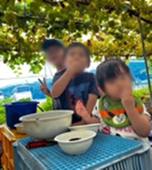 | ベンチャー隊に上進してきた2 人のスカウトたちと流しそうめんを始めとした歓迎会を行いました。気温もまだ高く冷たいそうめんをおいしそうに食べていました。新しいスカウトとも打ち解けられ、楽しい時間を過ごすことができました。 |