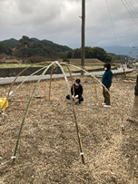| みんなの都合が合わず、参加者はなんと1名!団委員さんの畑を借りて石積みの釜戸を作り、野外調理をしました。終了後、2名が加わって春休みのキャンプの相談。人数が少なそうなので、地区合同の可能性も出てきました。 |