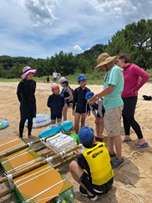 | 子供たちの夏休み初日!東予休暇村の海で遊びました。前回の活動で作ったイカダを浮かべます。集合、点呼をしてそれぞれ持ち寄ったライフジャケットと浮き輪を装着します。 ➡ 詳しくはこちら。 |